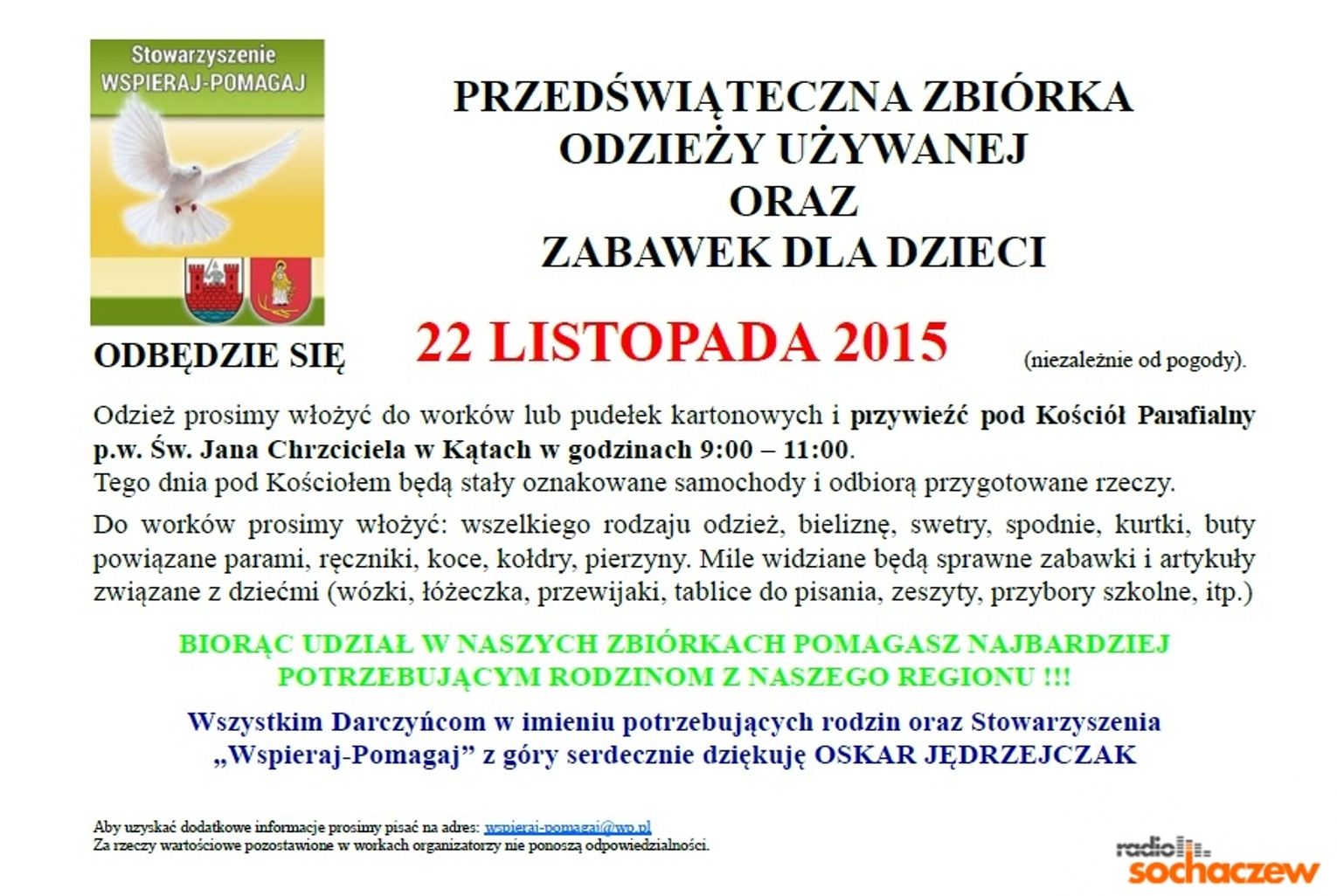 Stowarzyszenie "Wspieraj Pomagaj" 22 listopada organizuje w Kątach (Gmina Sochaczew) zbiórkę rzeczy dla potrzebujących.