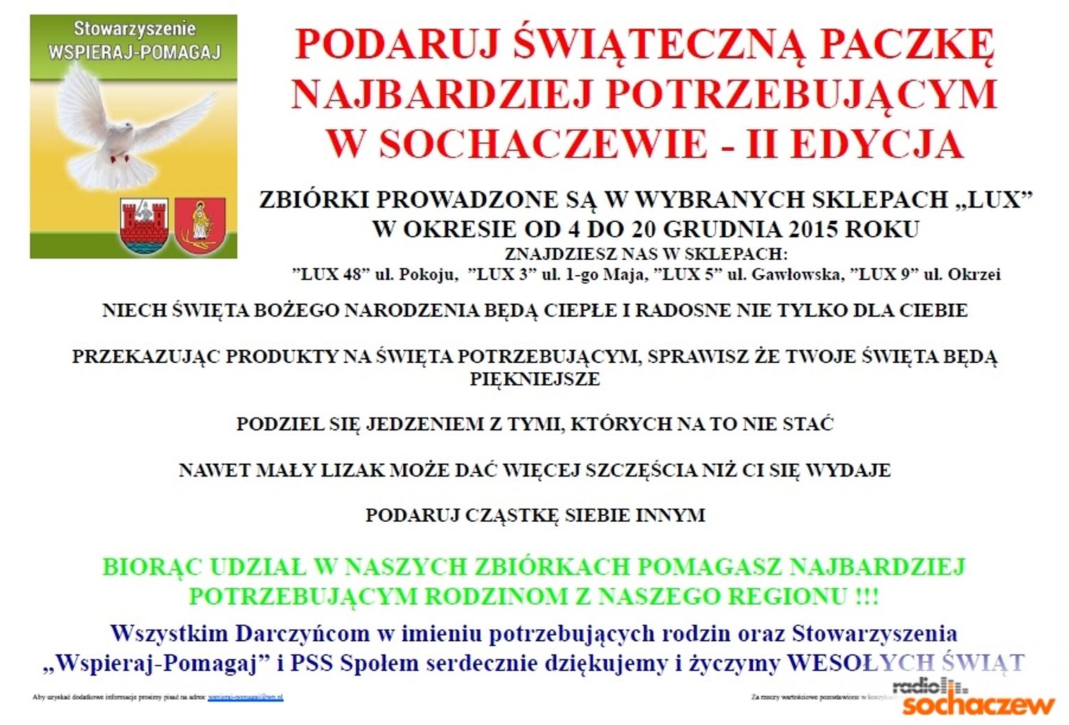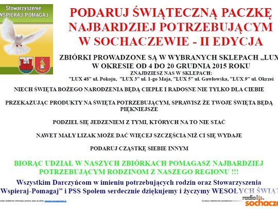 Stowarzyszenie "WSPIERAJ-POMAGAJ" organizuje akcję pomocową w sklepach LUX w Sochaczewie. Niech Święta Bożego Narodzenia będą cieple i radosne nie tylko dla Ciebie.