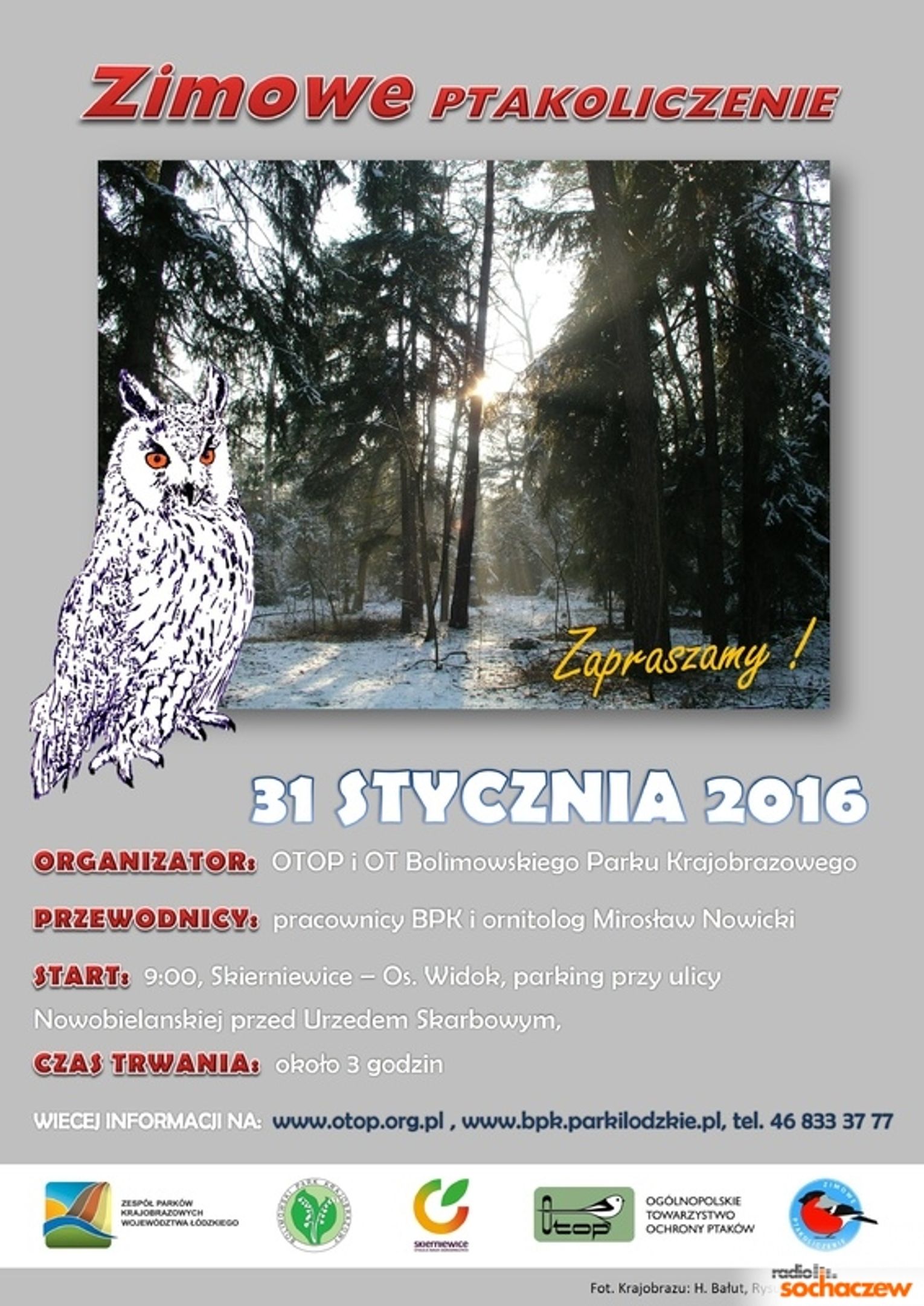 W niedzielę, 31 stycznia o 9.00 na skraju Puszczy Bolimowskiej odbędzie się Zimowe Ptakoliczenie. W akcji może wziąć udział każdy, niezależnie od wieku i posiadanej wiedzy. Organizatorami akcji są Oddział Terenowy Bolimowskiego Parku Krajobrazowego oraz Miasto Skierniewice.