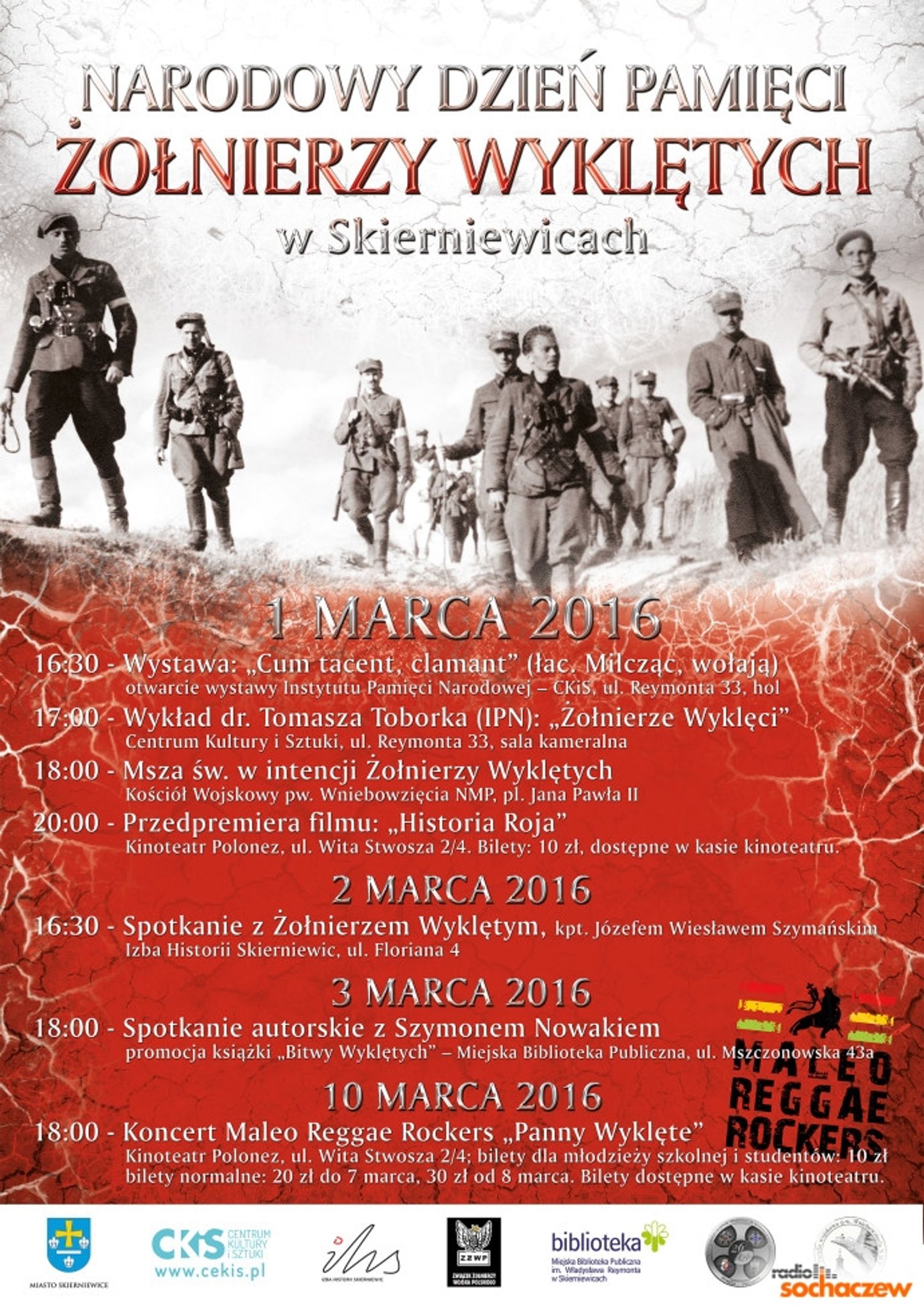 Otwarcie wystawy Instytutu Pamięci Narodowej, wykład, przedpremierowy pokaz filmu „Historia Roja", spotkania oraz wyjątkowy koncert Melo Reggae Rockers z projektem „Panny Wyklęte". Tak w Skierniewicach będzie wyglądał początek marca. Wszystkie zaplanowane wydarzenia, związane są ze skierniewickimi obchodami Narodowego Dnia Pamięci Żołnierzy Wyklętych.