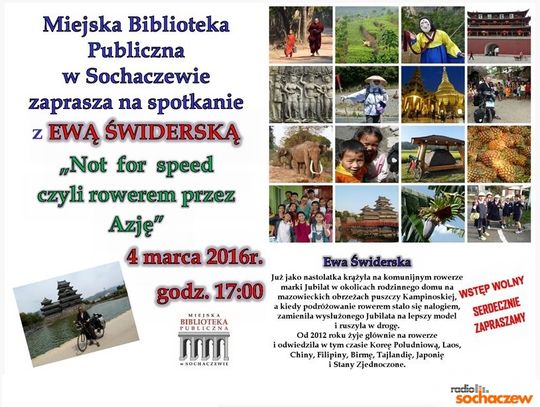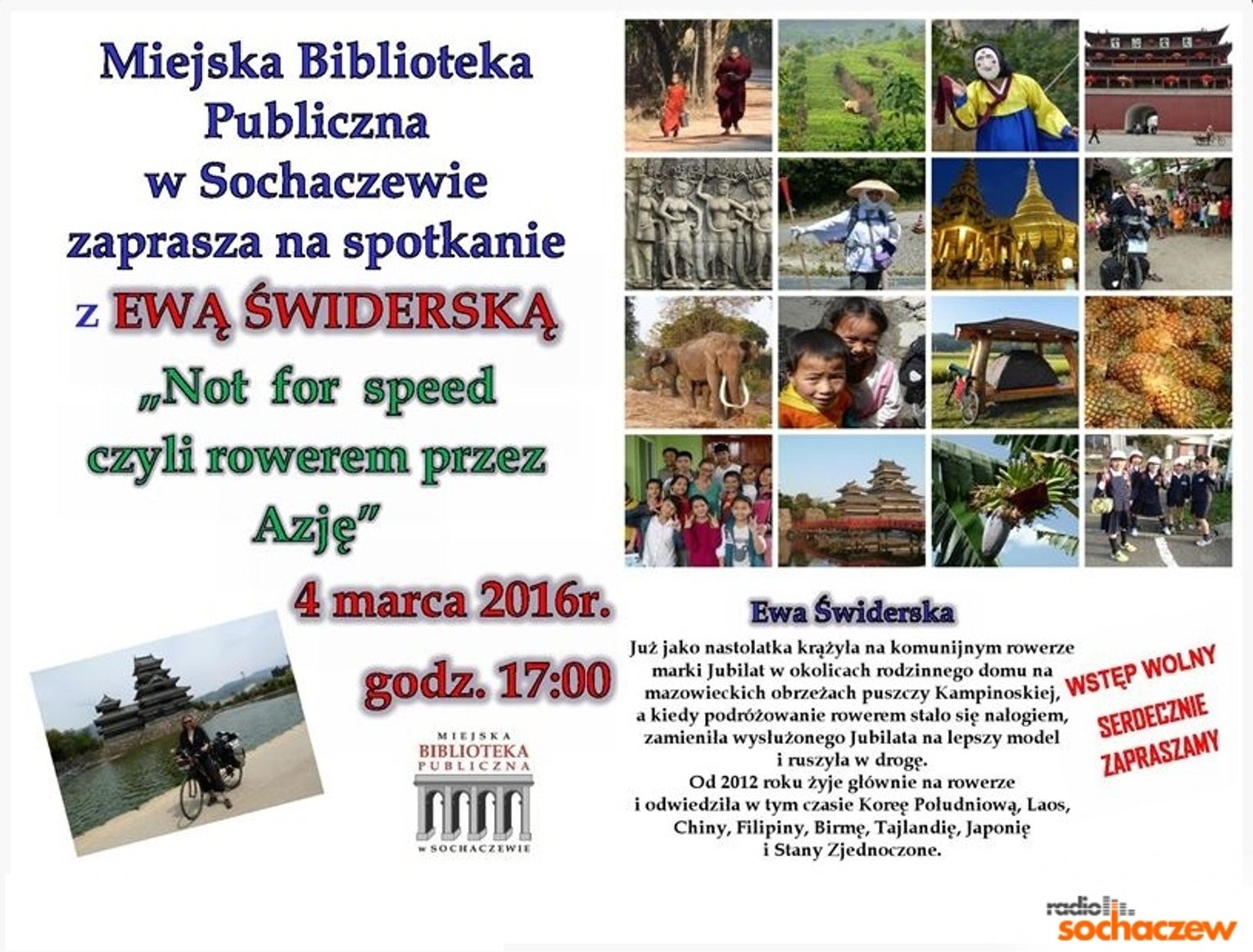 Miejska Biblioteka Publiczna w Sochaczewie zaprasza na spotkanie z sochaczewianką Ewą Świderską „NOT FOR SPEED CZYLI ROWEREM PRZEZ AZJĘ”. Będzie to pokaz zdjęć z podróży pani Ewy oraz opowieść na temat jej rowerowej przygody ze światem.