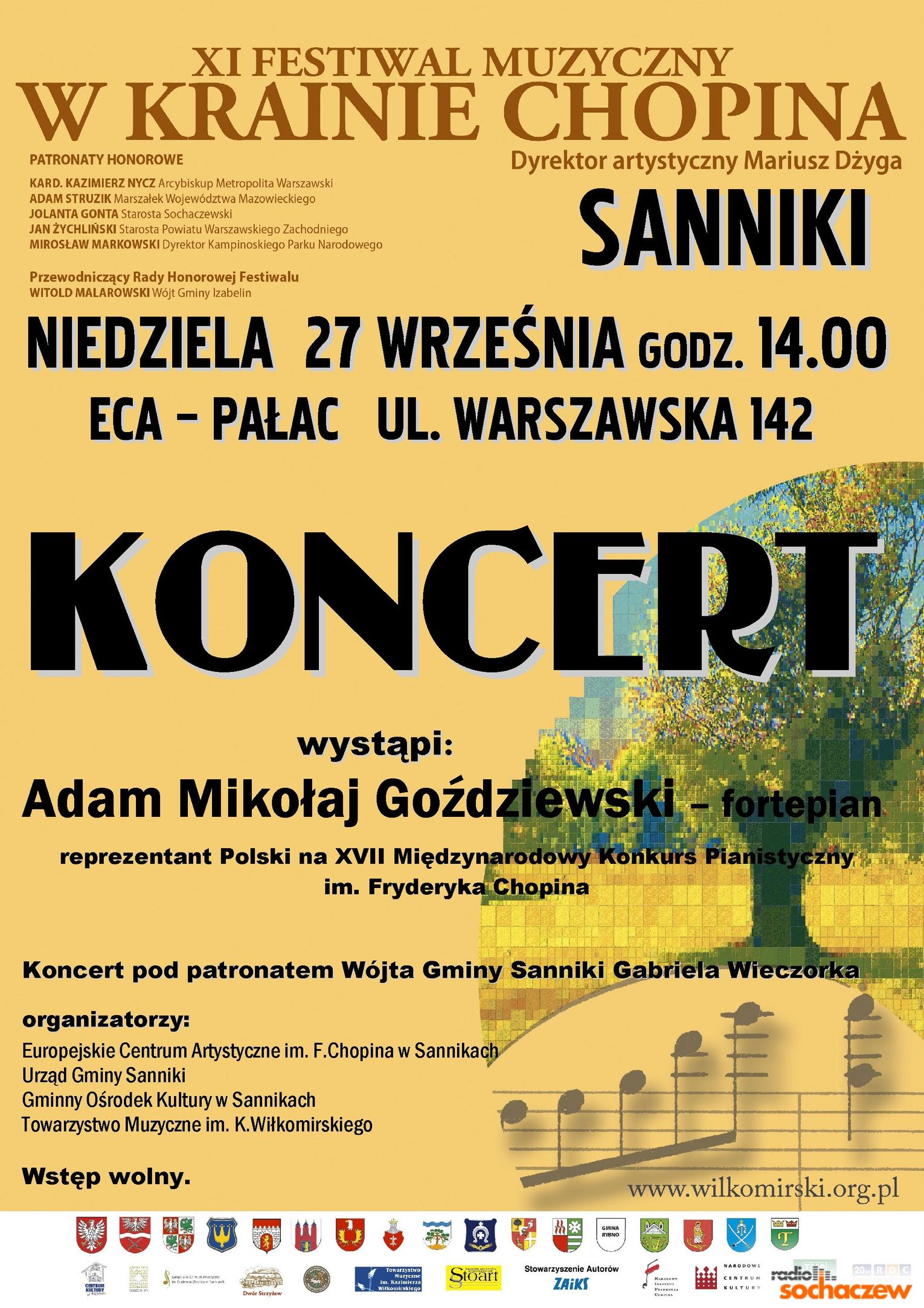 W niedzielę 27 września, przeniesiemy się do pałacu w Sannikach, ściśle związanego z Chopinem: „W Sannikach Fryderykowi i jego przyjaciołom czas upływał na muzykowaniu, zabawach i spacerach po ocienionym parku, a także na składaniu sąsiedzkich wizyt i wycieczkach po okolicy". Pałac prezentuje się wspaniale, po gruntownej, długotrwałej renowacji, ukończonej jesienią ubiegłego roku. O godzinie 14.00 rozpocznie się recital fortepianowy w wykonaniu Adama Mikołaja Goździewskiego - reprezentanta Polski na XVII Międzynarodowy Konkurs Pianistyczny im. Fryderyka Chopina, który rozpoczyna się już 1 października w Warszawie.