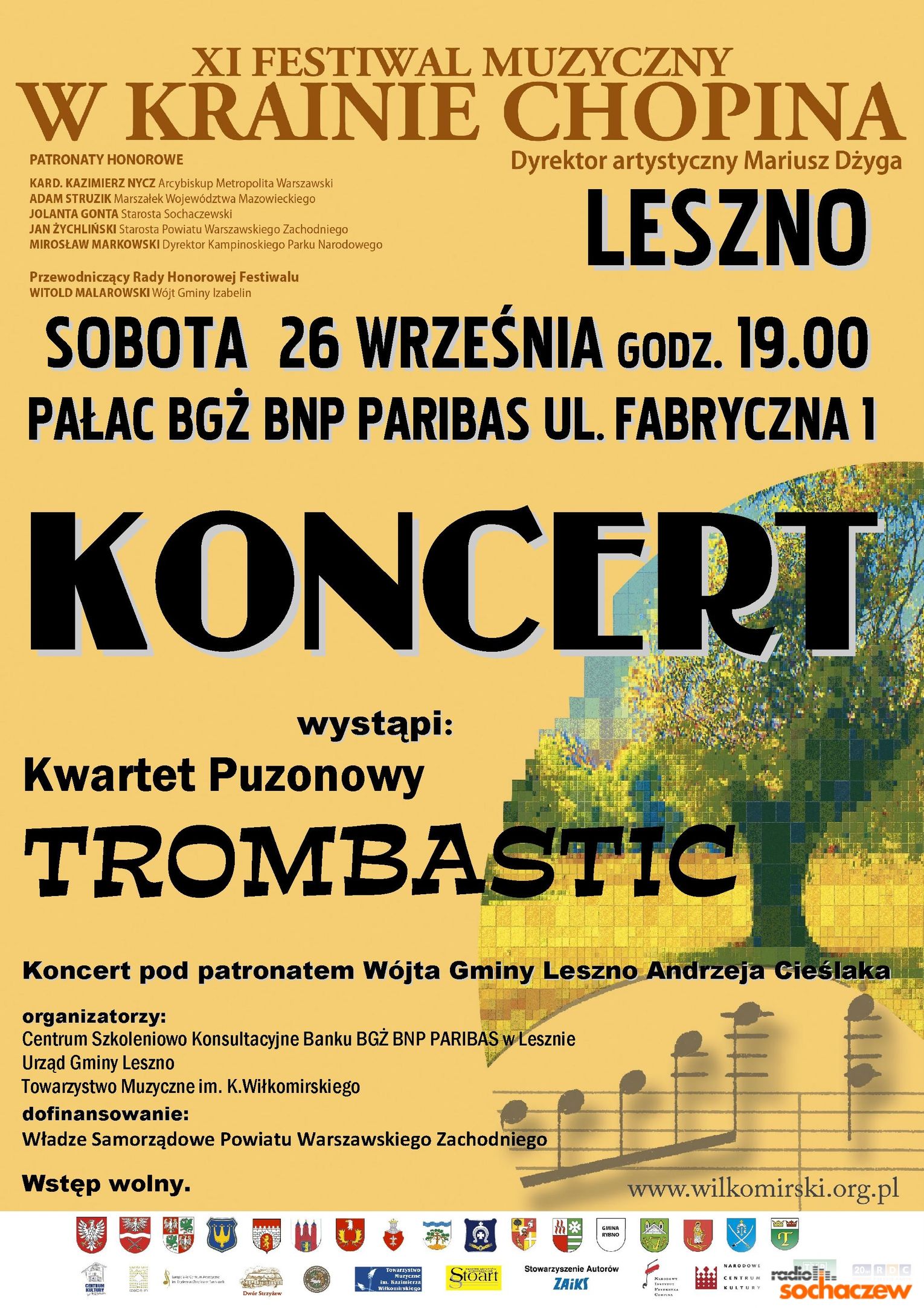 W najbliższą sobotę 26 września o godzinie 19.00 w pałacu BGŻ BNP PARIBAS w Lesznie, zagra dla nas kwartet puzonowy „Trombastic". Zespół powstał w 1987 roku. Regularnie koncertuje w kraju i za granicą, a tworzą go najwybitniejsi puzoniści czołowych warszawskich orkiestr. W programie sobotniego koncertu znajdą się puzonowe transkrypcje najbardziej znanych utworów literatury muzycznej.